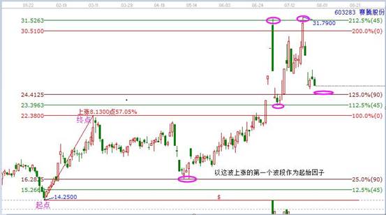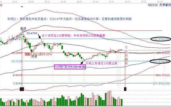 以5月20日的低點和6月20日的高點為起始點,選擇這波上漲空間為波動因子,同時結(jié)合市場走勢保留了江恩45度分割比率,圖形如下: