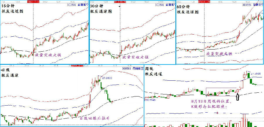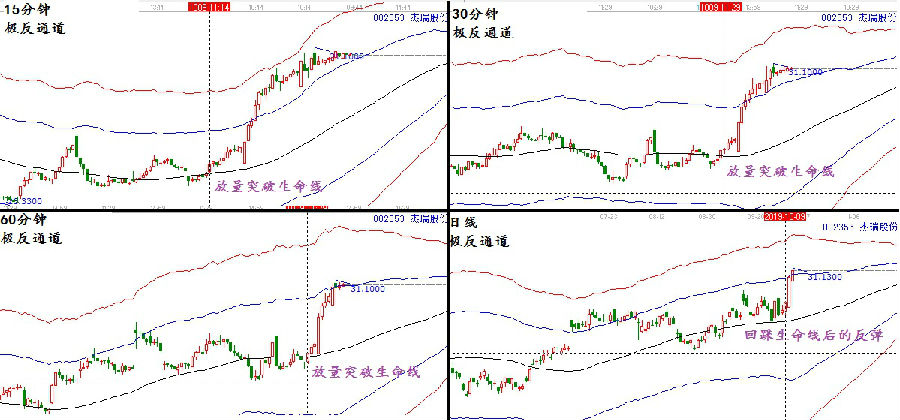 趨勢(shì)共振模型一類:以極反通道生命線為判斷依據(jù),生命線是判斷市場趨勢(shì)強(qiáng)弱的分界線,可以快速直觀的判斷出市場短期,中期,及長期的趨勢(shì)強(qiáng)弱,如果各周期都是處于強(qiáng)勢(shì)區(qū),這就是一種共振。因此,在實(shí)戰(zhàn)交易中,投資者關(guān)注周線,日線,60分鐘,30分鐘,及15分鐘,如果這幾個(gè)周期都是處于生命線附近,走勢(shì)協(xié)同,就會(huì)出現(xiàn)短期的快速拉升走勢(shì)。