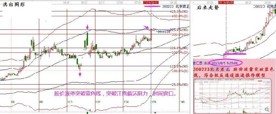 下圖是北京君正之前的一個(gè)激進(jìn)買點(diǎn),現(xiàn)在做個(gè)回顧。8月2日是江恩時(shí)間窗口,當(dāng)天股價(jià)放量漲停突破藍(lán)色線,江恩循環(huán)阻力點(diǎn),構(gòu)成了激進(jìn)買點(diǎn),隨后市場(chǎng)震蕩不破藍(lán)色線,維持藍(lán)色線與紅色線區(qū)間內(nèi)的趨勢(shì)上攻走勢(shì)。
