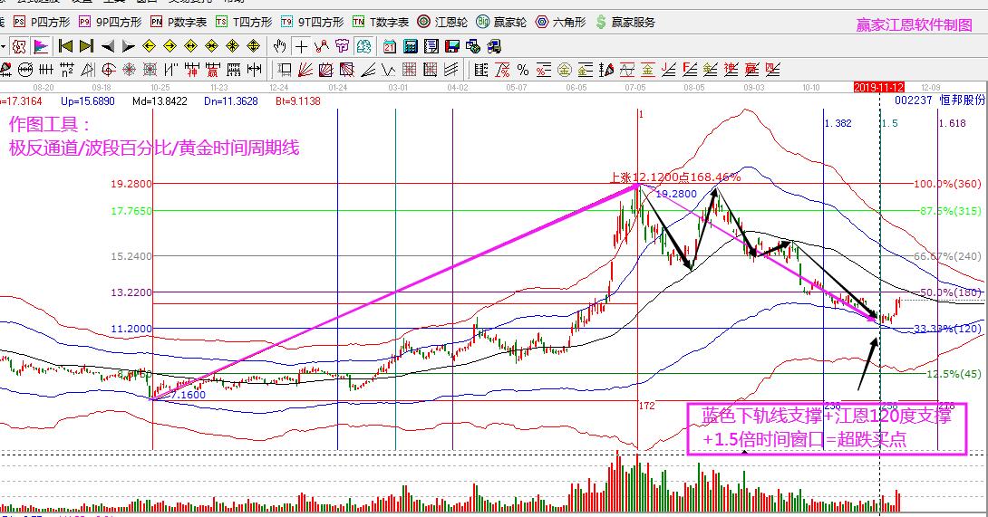 下圖是恒邦股份的超跌買點(diǎn)展示:股價(jià)調(diào)整到極反通道藍(lán)色下軌線,同時(shí),江恩120度分割位支撐附近,疊加1.5倍時(shí)間窗口,短期共振向上,符合極反通道藍(lán)色下軌線超跌買點(diǎn)要求。短期從藍(lán)色下軌線反彈超10%,時(shí)間窗口11月12日為階段低點(diǎn)。按照規(guī)則買入,反彈目標(biāo)就是生命線。