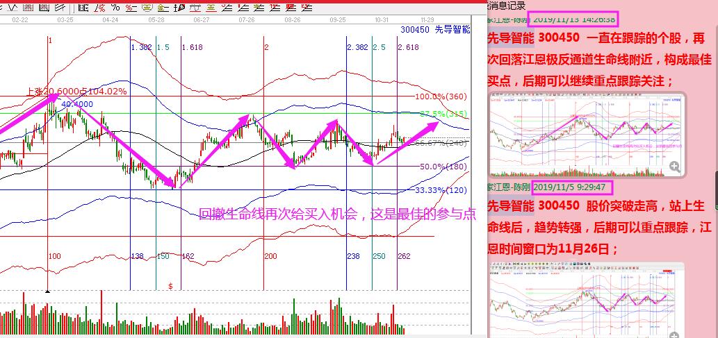 下圖是先導(dǎo)智能生命線的穩(wěn)健買點(diǎn)展示,10月28日股價(jià)放量突破生命線,隨后震蕩跌破,股價(jià)一直縮量生命線附近運(yùn)行,11月5日是站穩(wěn)生命線的第三個(gè)交易日,首次開(kāi)始關(guān)注,11月13日股價(jià)在經(jīng)過(guò)拉升之后回撤至江恩240度支撐點(diǎn),與生命線支撐點(diǎn)很近,價(jià)格上形成共振走勢(shì),同時(shí)股價(jià)處于明確的上漲周期中,故,趨勢(shì),價(jià)格,時(shí)間符合極反通道穩(wěn)健買點(diǎn)要求,按照規(guī)則買入,持股目標(biāo)就是藍(lán)色線。
