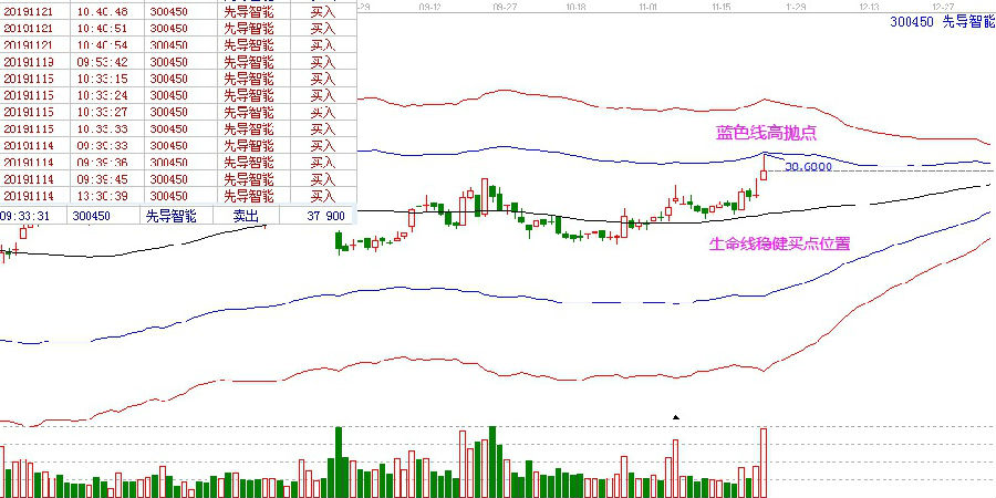 先導(dǎo)智能生命線啟動(dòng)之后,11月22日攻擊到了目標(biāo)點(diǎn)藍(lán)色線,這是我們生命線穩(wěn)健買點(diǎn)的目標(biāo)點(diǎn),按照規(guī)則可以獲利賣出。下面是具體的走勢(shì)圖: