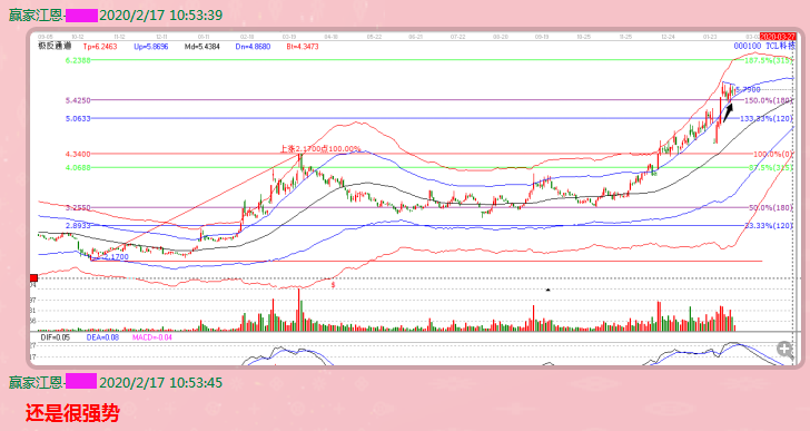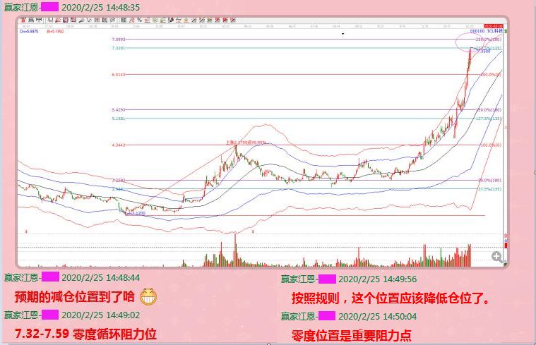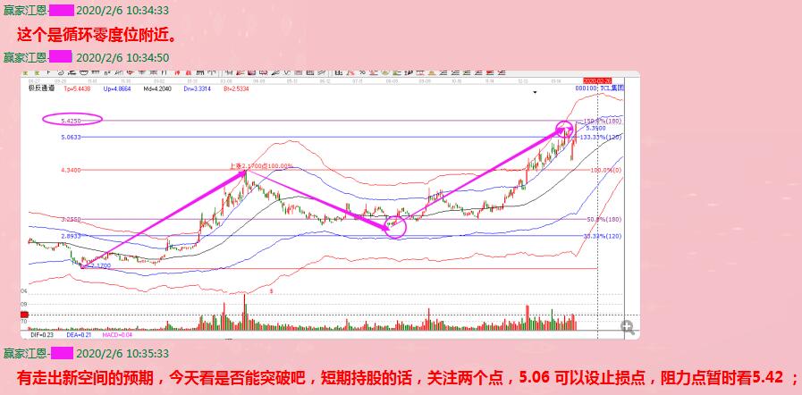 下圖是TCL科技在2月6日的技術(shù)分析圖形,具體的作圖方法是,以2018年10月19日的低點和2019年3月25日的高點為起始點,作出江恩波段百分比延伸線(江恩經(jīng)典價格循環(huán)分析工具之一),保留120度和180度分割(后期調(diào)整為135度和180度,更契合市場的歷史走勢)。從圖中可以看到,股價在從最低點2.17起漲后,紅色線見頂回落,并最終在江恩波段百分比120度與180度空間完成止跌,這個分割位是我們在實戰(zhàn)運用中頻繁強調(diào)的調(diào)整位。止跌之后震蕩上行,并在2019年12月17日突破站上了100%的零度位,此為前期高點,股價在突破后,進入到了新的空間,即100%到133.3%-150%分割區(qū)間,價格波動空間為4.34-5.42。2月6日股價放量上攻,突破了5.06直接挑戰(zhàn)5.42,此時我們要關(guān)注的是,該循環(huán)空間是否會打開,股價進入新的空間。其關(guān)鍵點就是,價格突破5.42。此位置對應(yīng)了33.33%-50%區(qū)間。當(dāng)天最終股價放量漲停突破。