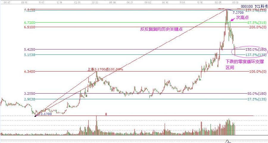 股價的波動很快,但是如何去應(yīng)對市場的漲跌,漲了是否有賣出的位置,跌了是否有買入的位置,成功的投資者都是逆向的,在普通散戶追入的時候,他們賣出,而在普通散戶割肉的時候,他們進場。TCL科技幾乎可以賣在最高的區(qū)間,而隨后股價反彈形成的次級別高點一樣是可以借助江恩工具來判斷出來的,這是股價向下波動,反抽的關(guān)鍵次高點形成位,是江恩波段315度分割點??梢钥吹?,隨后股價便跌破6.51關(guān)鍵點,下尋到新的循環(huán)點。