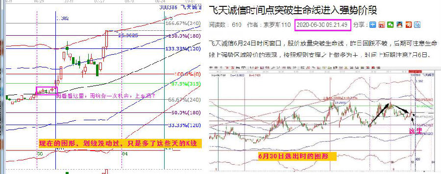 下面我們就通過時間和空間兩個方面來分析飛天誠信的買入點(diǎn)位。首先,我們通過時間分析工具(黃金時間周期線)來對2018年10月12日~2020年1月8日這段走勢進(jìn)行研究,發(fā)現(xiàn)其在藍(lán)色豎線的位置發(fā)生了趨勢變化,那么在未來同樣7月6日藍(lán)線的位置會不會變化呢?其走勢證明在藍(lán)線的位置,股價開始了快速拉升階段。然后在通過時間分析工具(等距時間周期線)來對2020年4月1日~2020年5月15日這段走勢進(jìn)行研究,發(fā)現(xiàn)其在6月24日也是一個時間窗口。而在這一天股價站上了極反通道的黑色生命線這個重要支撐位置,隨后幾天在對支撐進(jìn)行確認(rèn)之后,在前面提到7月6日藍(lán)線的位置開始了快速拉升。