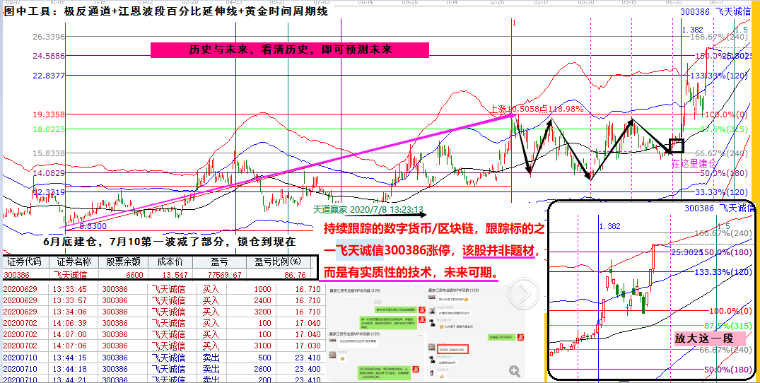 回顧總結(jié)學(xué)習(xí)該股的選出依據(jù)及操作信號,歷史前一波的上漲作為起始因子,那么未來的走勢江恩時空線幫你提前顯現(xiàn)!遵循江恩所言,精進(jìn)研究歷史,即可掌控未來!飛天誠信同步6月底建倉,7月10日第一波高點(diǎn)減倉,剩下的鎖倉至今,單只個股利潤逼近8萬元,盈利超80%,這就是波段交易的魅力,你看懂了嗎?