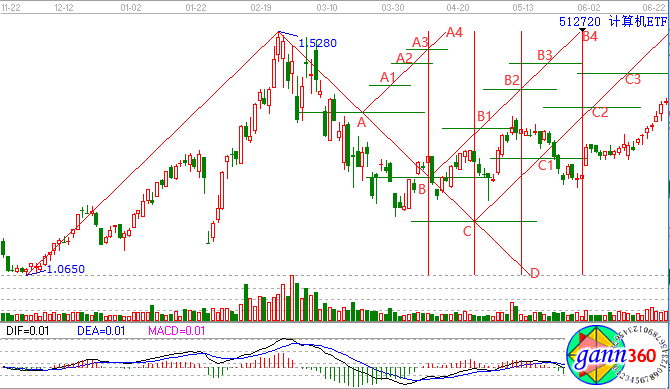 圖中A點(diǎn)所對(duì)應(yīng)的時(shí)間窗口是短期一波上漲的結(jié)束,之后便是下跌,A4點(diǎn)和D點(diǎn)所對(duì)應(yīng)的時(shí)間窗口同樣也是上漲的結(jié)束,之后出現(xiàn)下跌。那么計(jì)算機(jī)ETF接下來(lái)怎么走呢?