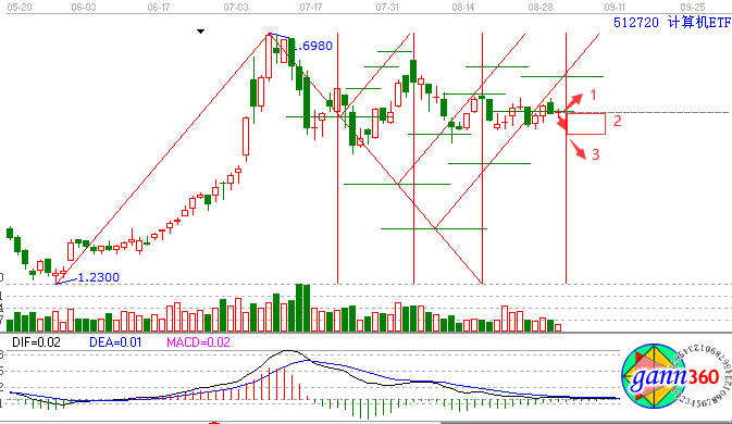 今天我們就借助贏家江恩軟件中的轉(zhuǎn)折趨勢(shì)線來(lái)對(duì)于計(jì)算機(jī)板塊來(lái)進(jìn)行分析,相應(yīng)的我們就需要在計(jì)算機(jī)ETF的K圖中進(jìn)行作圖分析。(圖中的紅色斜線為趨勢(shì)線,綠色橫線為支撐、壓力線,紅色豎線是為了方便展示轉(zhuǎn)折點(diǎn)所對(duì)應(yīng)的K線位置)