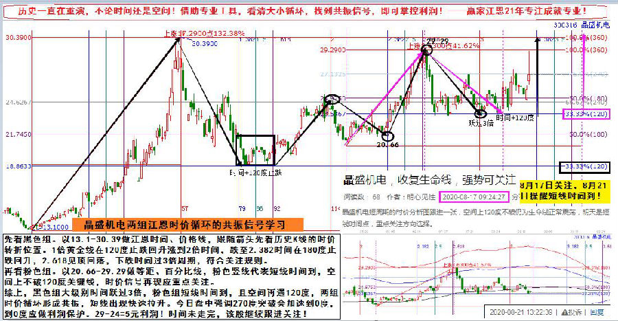 綜上,黑色組大級別時間躍過3倍,粉色組短線時間到,且空間再遇120度,兩組時價循環(huán)形成共振,短線出現(xiàn)快速拉升。今日盤中強調(diào)270度突破會加速到0度,到0度應(yīng)做利潤保護。29-24=5元利潤!時間未走完,該股繼續(xù)跟進關(guān)注!