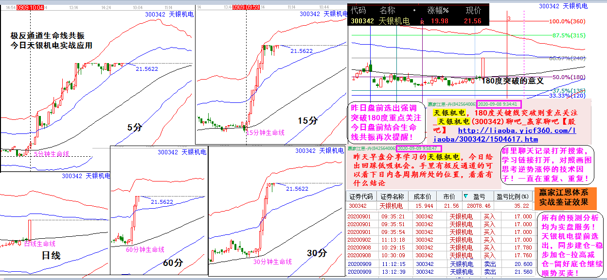 指數(shù)繼續(xù)如期殺跌,空間上已經(jīng)進入第一預(yù)期支撐區(qū)間,但時間未到,弱勢反復(fù)再所難免。而如此弱勢的環(huán)境下,贏家江恩按照江恩時空規(guī)則篩選出的天銀機電,今日逆勢封板20%的利潤回饋給每位認真關(guān)注贏家消息,懂得贏家模型與規(guī)則的朋友。今日不闡述具體技術(shù)要點,都在圖中做了標注,有心提升的朋友仔細看。