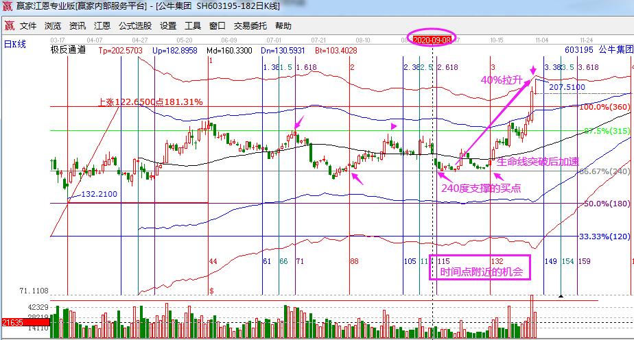 每當(dāng)我們從市場(chǎng)中通過江恩理論體系獲得利潤(rùn)的時(shí)候,我們總是會(huì)感嘆江恩理論的獨(dú)特和神奇,也感謝江恩老爺子對(duì)金融市場(chǎng)技術(shù)分析的偉大貢獻(xiàn),他引入的時(shí)間分析,是所有決定市場(chǎng)漲跌因素中最重要的因子,時(shí)間未足夠抵達(dá)前不會(huì)出現(xiàn)向上或者向下的大行情,時(shí)間因素會(huì)失衡于空間和成交量。根據(jù)時(shí)間規(guī)則,當(dāng)時(shí)間到達(dá)時(shí),不管走勢(shì)是向上還是向下,成交量開始放大,空間才開始打開。因此,贏家在進(jìn)行實(shí)戰(zhàn)交易時(shí),首先考慮的就是時(shí)間因素。時(shí)間是否支撐股價(jià)的上漲,是否已經(jīng)給出方向,之后,才有交易的動(dòng)作。今天要講的公牛集團(tuán)的案例也是如此,我們借助江恩時(shí)間來感受下,市場(chǎng)的波段操作應(yīng)該怎么來做。