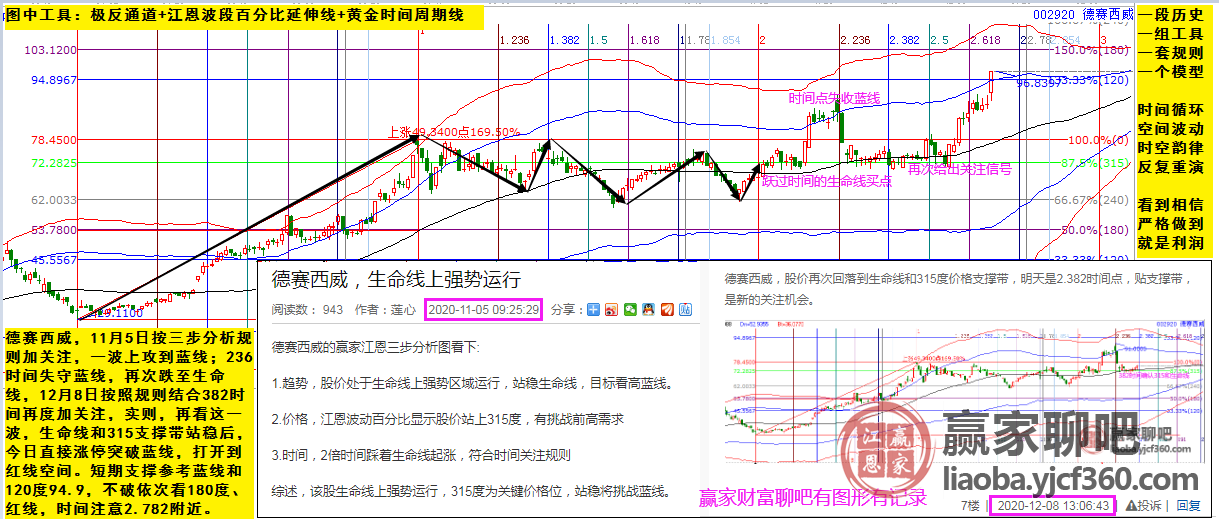 德賽西威,11月5日按三步分析規(guī)則加關(guān)注,一波上攻到藍線;236時間失守藍線,再次跌至生命線,12月8日按照規(guī)則結(jié)合382時間再度加關(guān)注,實則,再看這一波,生命線和315支撐帶站穩(wěn)后,今日直接漲停突破藍線,打開到紅線空間。短期支撐參考藍線和120度94.9,不破依次看180度、紅線,時間注意2.782附近。