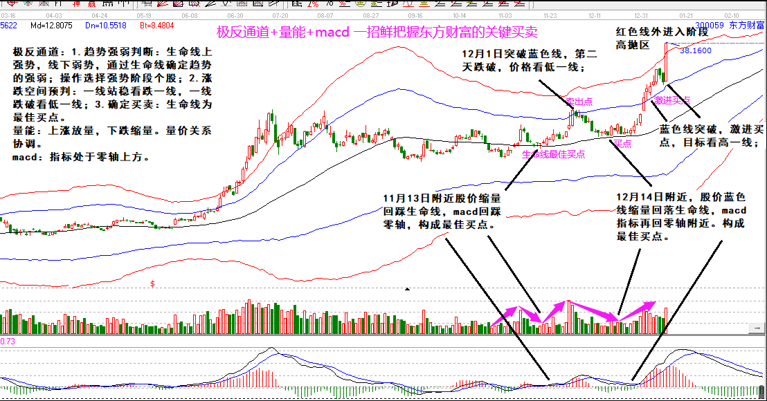 極反通道+量能+macd,一招鮮把握東方財富的關(guān)鍵買賣。