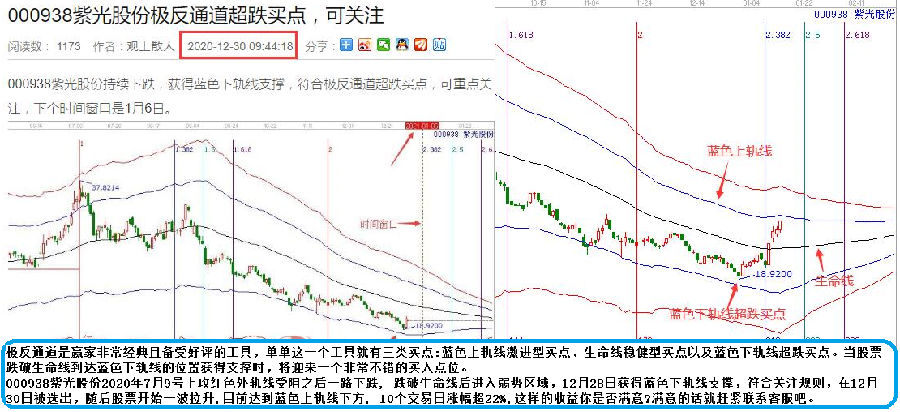 極反通道是贏家非常經(jīng)典且備受好評的工具,單單這一個工具就有三類買點:藍色上軌線激進型買點、生命線穩(wěn)健型買點以及藍色下軌線超跌買點。當股票跌破生命線到達藍色下軌線的位置獲得支撐時,將迎來一個非常不錯的買入點位。