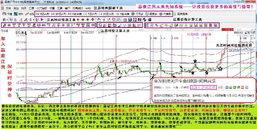 金發(fā)科技,11月27日盤前選出,生命線上穩(wěn)步震蕩,時間窗口配合即是重點關(guān)注信號。短線上攻到藍線受阻回落,再次給出生命線機會,注意那個2倍時間線,躍過后踩著生命線,踏上315度,一騎絕塵直達紅線!1個月時間,生命線買,紅線到足足40%的漲幅。10萬本金,獲利4萬,這就是該模型的價值。堅持關(guān)注贏家學習的朋友,去復(fù)習近期的中國中免、東方財富、天齊鋰業(yè)、恒瑞醫(yī)藥、盛屯礦業(yè)、格林美、德賽電池、德賽西威等等,全部贏家聊吧有圖形有依據(jù)有跟進有留痕供驗證!波段牛股的模型一直分享,用心的你學會了嗎?更多江恩時空技術(shù)精彩應(yīng)用學習,聯(lián)系贏家客服吧~~~