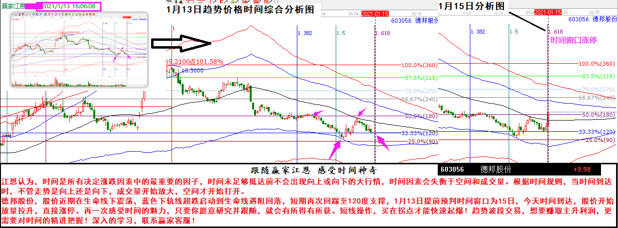 德邦股份,股價近期在生命線下震蕩,藍色下軌線超跌啟動到生命線遇阻回落,短期再次回踩至120度支撐,1月13日提前預(yù)判時間窗口為15日,今天時間到達,股價開始放量拉升,直接漲停。再一次感受時間的魅力,只要你愿意研究并跟隨,就會有所得有所獲。短線操作,買在拐點才能快速起爆!趨勢波段交易,想要賺取主升利潤,更需要對時間的精進把握!深入的學習,聯(lián)系贏家客服!