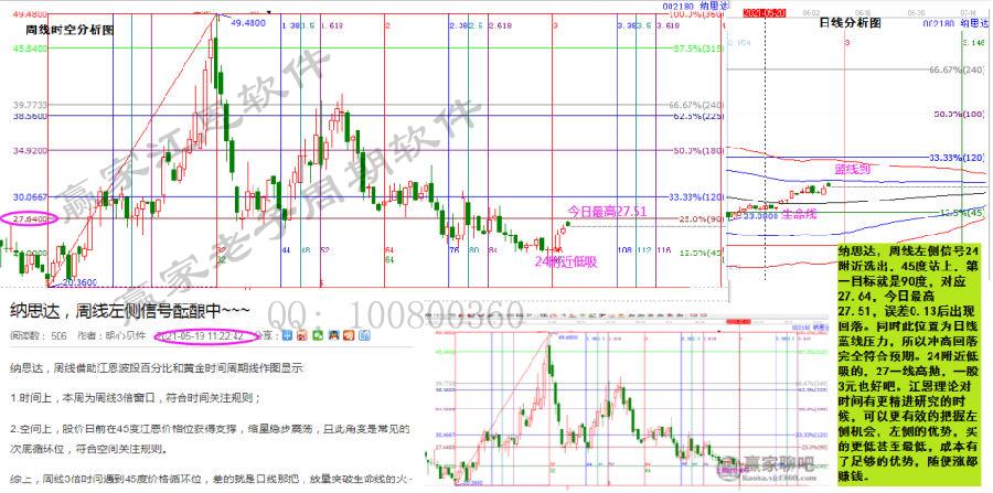 納思達(dá),周線左側(cè)信號(hào)24附近選出,45度站上,第一目標(biāo)就是90度,對(duì)應(yīng)點(diǎn)位27.64,今日最高27.51,誤差0.13后出現(xiàn)回落。同時(shí)此位置為日線藍(lán)線壓力,所以沖高回落完全符合預(yù)期。24附近低吸的,27一線高拋,一股3元也不錯(cuò)。江恩理論對(duì)時(shí)間有更精進(jìn)研究的時(shí)候,可以更有效的把握左側(cè)機(jī)會(huì),左側(cè)的優(yōu)勢(shì),買的更低甚至最低,成本有了足夠的優(yōu)勢(shì),隨便漲都賺錢。