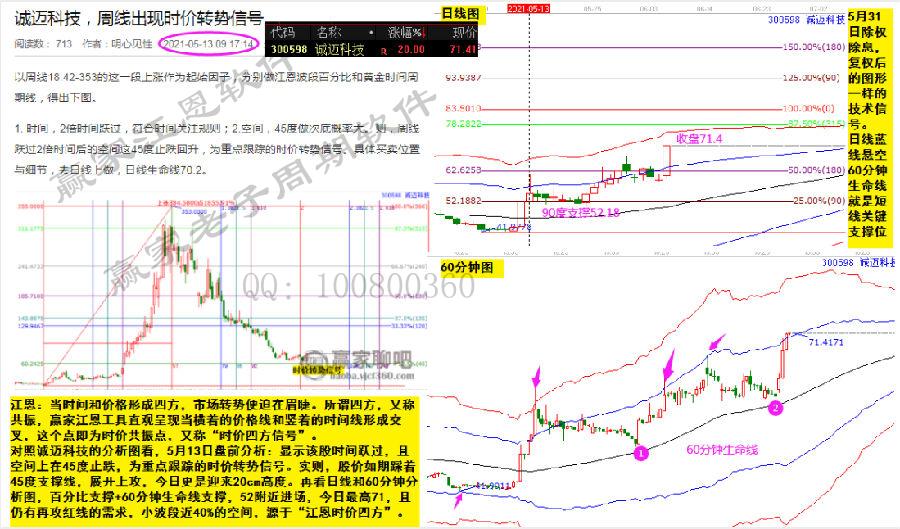 對(duì)照誠邁科技的分析圖看,5月13日盤前分析:顯示該股時(shí)間躍過,且空間上在45度止跌,為重點(diǎn)跟蹤的時(shí)價(jià)轉(zhuǎn)勢(shì)信號(hào)。實(shí)則,股價(jià)如期踩著45度支撐線,展開上攻,今日更是迎來20cm高度。再看日線和60分鐘分析圖,百分比支撐+60分鐘生命線支撐,52附近進(jìn)場(chǎng),今日最高71,且仍有再攻紅線的需求,小波段近40%的空間,源于“江恩時(shí)價(jià)四方”。