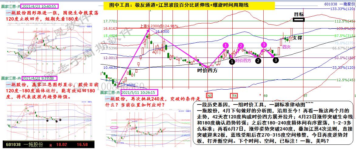 一拖股份,4月下旬做好的分析圖,沿用至今!再看一拖這兩個(gè)月的走勢(shì),42天在120度構(gòu)成時(shí)價(jià)四方展開拉升;4月23日漲停突破生命線和180度確認(rèn)趨勢(shì)轉(zhuǎn)強(qiáng);之后在180-240度箱體間有序震蕩,1-2-3多么標(biāo)準(zhǔn);再看6月7日,漲停姿勢(shì)突破240度,疊加江恩4次法則,直接突破迎來2板,藍(lán)線受阻后在270-315度空間修整,今日再度逆勢(shì)封板,打開新空間。下個(gè)時(shí)間、空間,已標(biāo)注!一拖,美嗎?