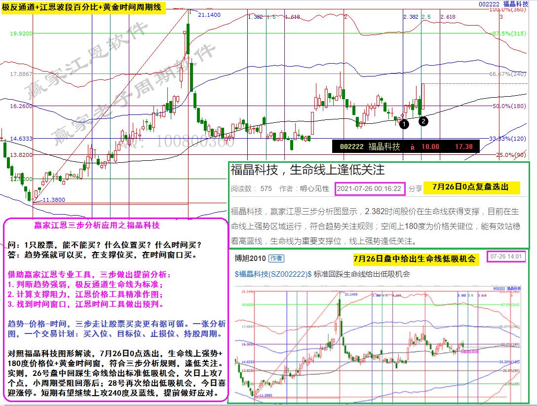 對照福晶科技圖形解讀,7月26日0點選出,生命線上強勢+180度價格位+黃金時間窗,符合三步分析規(guī)則,逢低關注。實則,26號盤中回踩生命線給出標準低吸機會,次日上攻7個點,小周期受阻回落后;28號再次給出低吸機會,今日喜迎漲停。短期有望繼續(xù)上攻240度及藍線,提前做好應對。