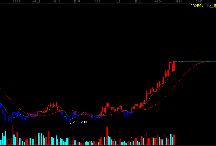 *:乾坤k線:002594,依據(jù)乾坤k線操作規(guī)則,11月5日以后,002594進入紅色可操作區(qū)域,(依據(jù):江恩12法則之決定市場各趨勢轉(zhuǎn)向特點:用不同顏色k線代表多空和多空臨界點,同時伴有出局線關(guān)注線給出買賣建議;紅色安全操作區(qū),藍色風險觀望區(qū),紅色關(guān)注線,深藍出局線)