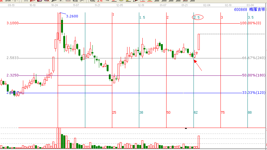 ?:價格分析:江恩價格百分比:每一條線都起到一個壓力支撐的作用,1月25日600868此票處于江恩價格百分比的240度強(qiáng)支撐位置,和極反生命線形成共振。