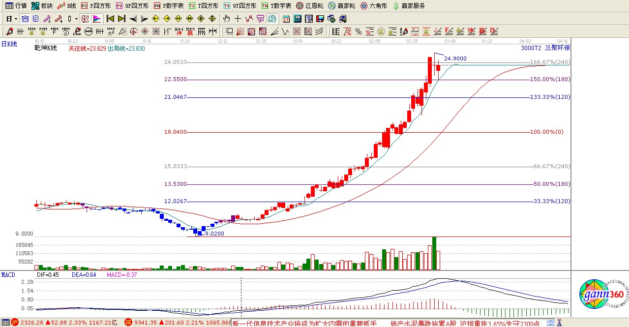 江恩價(jià)格百分比9.02做起點(diǎn)作圖可以看出來(lái)在其120度180度240度位置100%(0)度位置都進(jìn)行了震蕩整理。這樣就可以提前算出未來(lái)震蕩區(qū)間了。