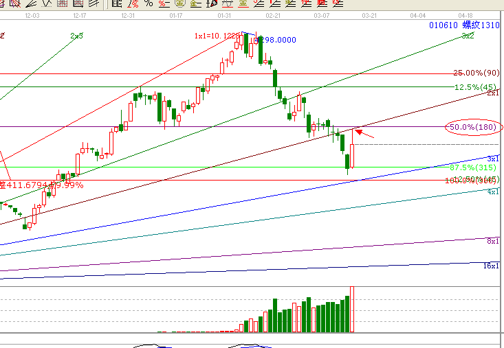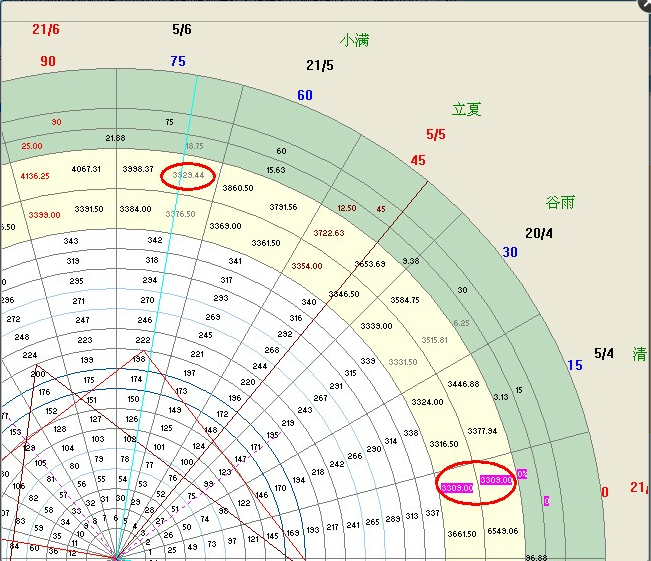 運用江恩輪種輪3月15日分析的螺紋1310,上方阻力3929點,當天最高點3920點之后迅速回落,(輪種輪,是江恩發(fā)明的經(jīng)典工具之一,其靈感來自于宇宙時空關(guān)系,)