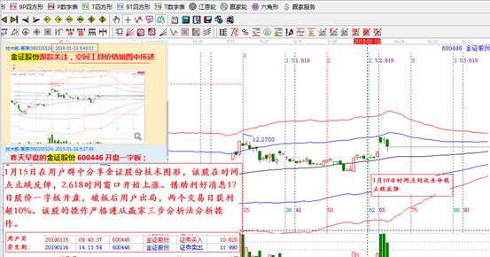 我們看到市場在1月10日江恩2.5倍分割比例這天縮量回踩到生命線不破,短期止跌,股價在 1月15日2.618分割位的時間窗口開始上漲,并在1月17日一字板開盤。1月15日技術(shù)部老師在用戶VIP群分享了技術(shù)圖形,有用戶介入后,兩天盈利超過十個點。