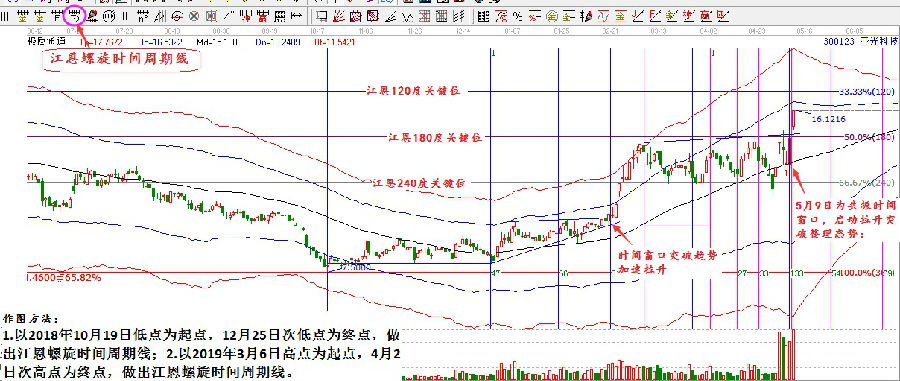 亞光科技(300123):1.以2018年10月19日低點(diǎn)為起點(diǎn),12月25日次低點(diǎn)為終點(diǎn),做出江恩螺旋時(shí)間周期線;2.以2019年3月6日高點(diǎn)為起點(diǎn),4月2日次高點(diǎn)為終點(diǎn),做出江恩螺旋時(shí)間周期線。做出兩組時(shí)間工具,結(jié)合極反通道,可以得出如下分析圖形: