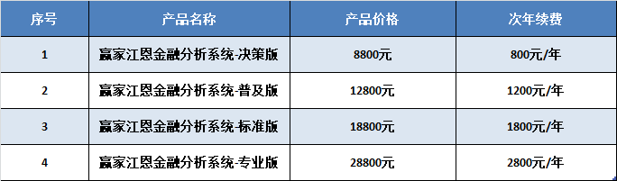 現(xiàn)綜合各方面因素,為了公司的可持續(xù)發(fā)展并能為客戶提供長期優(yōu)質(zhì)的服務(wù),公司自2021年4月1日起,正式對贏家江恩“決策版”、“普及版”、“標(biāo)準(zhǔn)版”、“專業(yè)版”系統(tǒng)的續(xù)費(fèi)價格做出調(diào)整。(具體收費(fèi)詳情見下表)
