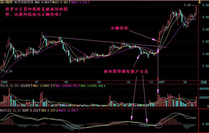 該股在2006年12月到2007年初的股價走勢,前期經(jīng)過一段時間的下跌行情,也就是主力進行洗盤操作的過程中,將散戶驅(qū)趕出局,破壞了下跌的圖形,之后股價經(jīng)過拉升,使用一根單日巨量陽線修復被破壞的圖形走勢,形成“石獅怒吼”的操作形態(tài),而對應(yīng)的成交量是巨量的形態(tài),macd指標中的走勢是金叉買入的操作形態(tài),這個時候股價處于均線的上方運行,均線的走勢是進行買入的信號,所以投資者綜合幾個方面的因素進行分析,是可以進行買入操作等待后市上漲的。