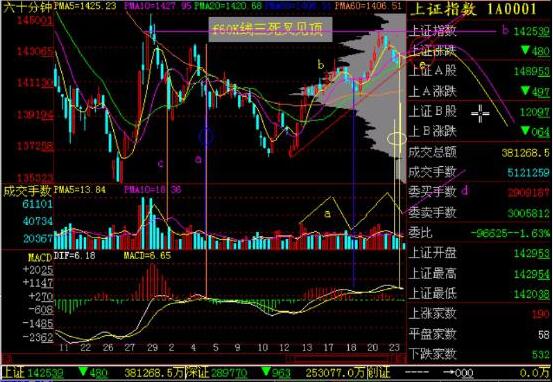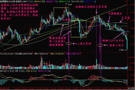 如上圖所示該股的頭部區(qū)間60分K線,有三組三死叉信號(hào),其中第一二兩組組合成三死叉頭背離,60分鐘的三死叉就是一個(gè)短期頭部的信號(hào),必須出貨!