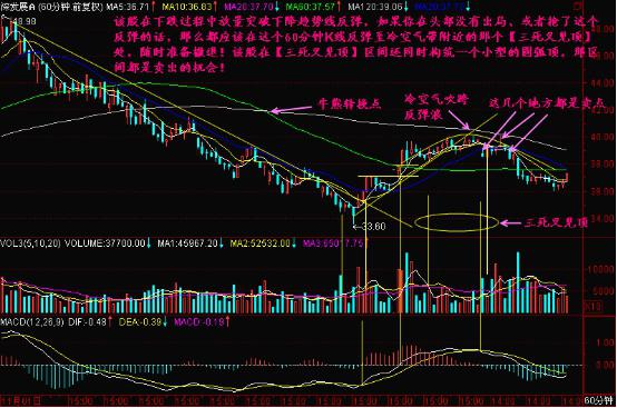 如上圖所示,該股在下跌過程中放量突破下降趨勢(shì)線反彈,如果你在頭部沒有出局、或者搶了這個(gè)反彈的話,那么都應(yīng)該在這個(gè)60分鐘K線反彈至冷空氣帶附近那個(gè)三死叉又見頂處,隨時(shí)準(zhǔn)備撤退!該股在三死叉又見頂區(qū)間還同時(shí)構(gòu)筑了一個(gè)小型的圓弧頂,那區(qū)間都是賣出的機(jī)會(huì)!