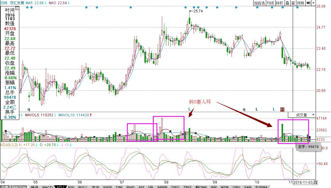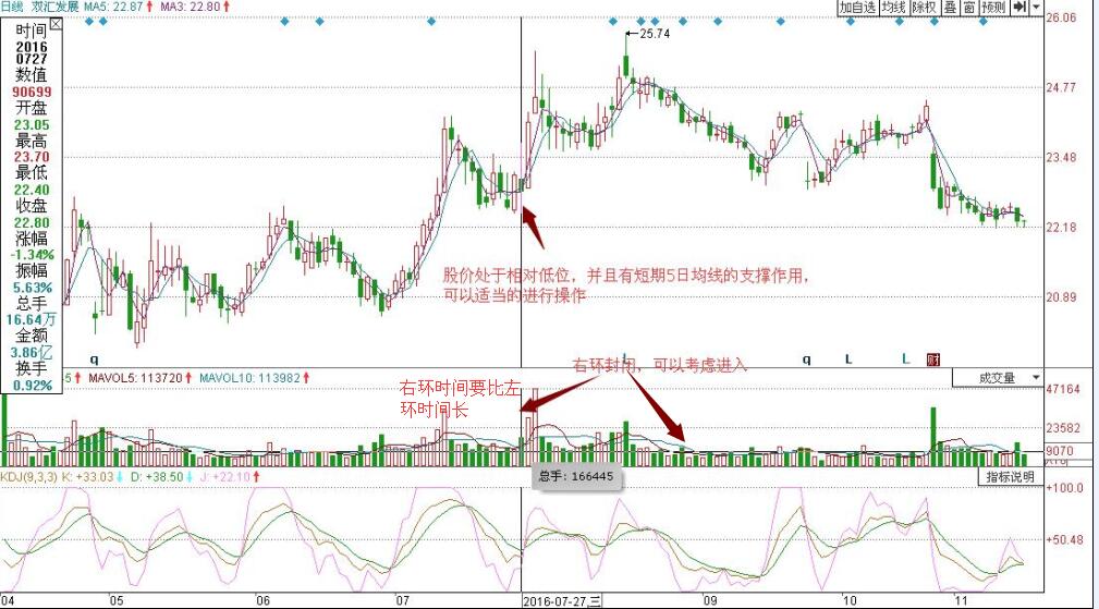 以2016年7月27日形成的斜8套人環(huán)為例進(jìn)行分析,前期股價經(jīng)過一個小幅的下跌走勢,在7月27日的時候形成一個反彈上漲的低點,并且股價處于相對低位,股價回踩5日均線作為上漲支撐,同時斜8套人環(huán)右環(huán)封閉,kdj指標(biāo)形成的是金叉買入的操作信號,投資者可以做短線操作,但是千萬不要在8字中進(jìn)行操作,因為被套的可能性比較大,可以在第一天介入,均線出現(xiàn)下跌回調(diào)的時候,及時的賣出獲利。