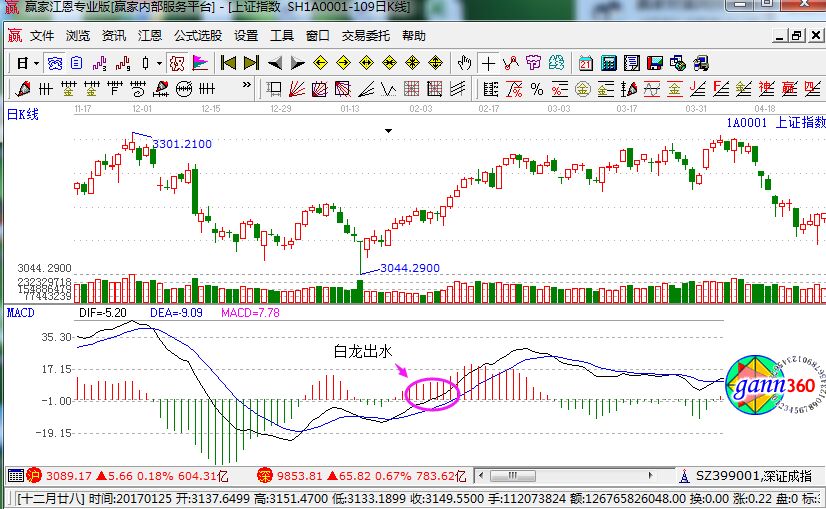白龍出水是什么意思?所謂的白龍其實(shí)指的就是macd指標(biāo)中的DIF線,0軸為海平面,由于股價長期低迷致使DIF猶如一條沉睡的巨龍潛伏于海底,當(dāng)某日受到外力作用緩緩上移至水面時突然一躍而起,似一條白龍直沖云宵,勢頭強(qiáng)勁股價被迅速推高,因此稱之為“白龍出水”。此形態(tài)是非常難得的短線買入時機(jī)。如下面運(yùn)用炒股軟件中所截取的上證走勢走勢圖。