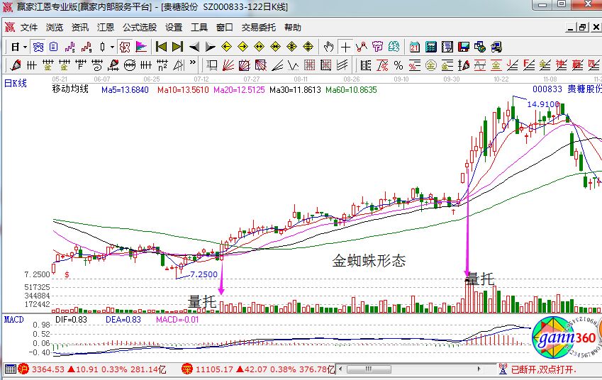 賺錢效應迅速的擴散,后來繼競買將價格持續(xù)推高,四條被打散的均線就如同伸開四腳的蜘蛛對價格形成支撐。所以這也是金蜘蛛形態(tài)的由來。出現(xiàn)金蜘蛛的時間周期越大的話,除了具備爆發(fā)力還同樣是具備持久性。接下來我們來看貴糖股份的走勢圖。