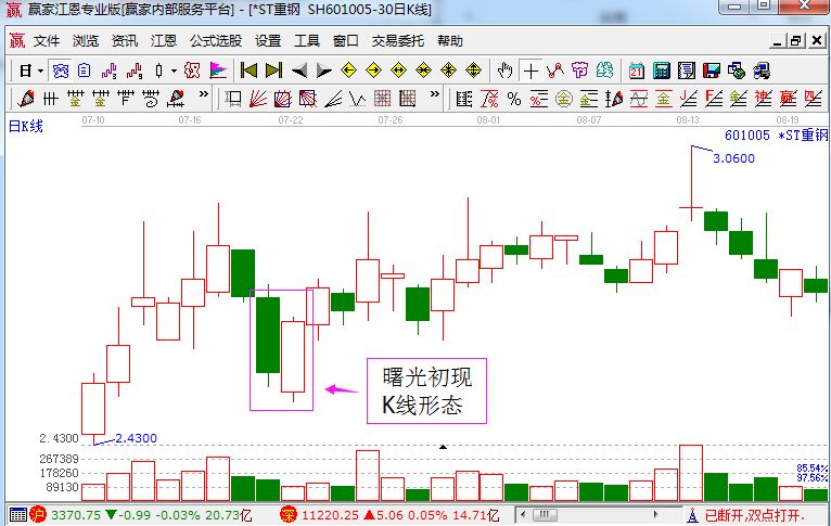 一般來說,曙光初現(xiàn)組合形態(tài)通常是出現(xiàn)在股價(jià)向下的趨勢(shì)當(dāng)中,第二天伴隨著股價(jià)的低開,可能意味著最后的空頭終于下定決心賣出自己手上的股票,隨后市場(chǎng)便發(fā)生轉(zhuǎn)變,轉(zhuǎn)為了上升的行情。在第二天的長(zhǎng)陽K線,意味著市場(chǎng)價(jià)格下跌動(dòng)力耗盡,空方策劃的最后一番攻擊失利,顯然多方已經(jīng)控制了大的局面。
