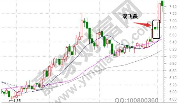 股票雙飛燕K線(xiàn)技術(shù)形態(tài)是怎么樣的?該形態(tài)的具體走勢(shì)為:K線(xiàn)走勢(shì)上呈現(xiàn)大陽(yáng)之后兩根并排上揚(yáng),成交量和振幅逐步遞減的十字星,而且均線(xiàn)系統(tǒng)上通常是以完美的多頭排列,價(jià)格沿著10日均線(xiàn)強(qiáng)勁攀升,如下圖所示。
