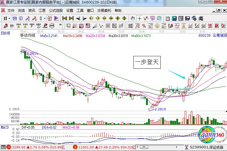 股票一步登天形態(tài)指的就是:股價(jià)在上升通道或者持續(xù)下降企穩(wěn)的過(guò)程中,前一日收出了一根縮量的十字星或者小實(shí)體星,次日放量收出中陽(yáng)線,量能是前期1到5倍之間,直奔漲停的走勢(shì)是更好的,在具體的實(shí)戰(zhàn)中,最好是在20日線、60日線穩(wěn)步向上的走勢(shì)。接下來(lái)我們來(lái)看云南城投走勢(shì)圖。