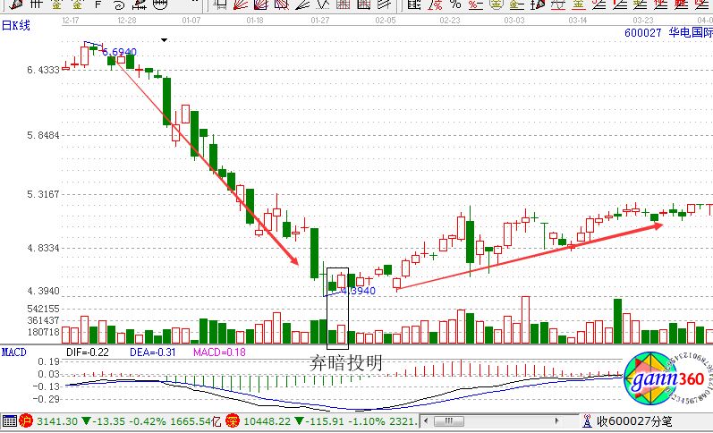 棄暗投明形態(tài)的名稱是怎么來的呢?它其實(shí)指的就是:K線下跌后的相對低位,或者盤整區(qū)域,或者上升趨勢的波段回調(diào)中,意味著多頭勢力的起步,空頭勢力的衰竭,K線將會上漲,所以投資者應(yīng)當(dāng)放棄之前下跌的判斷,轉(zhuǎn)為上漲,所以稱棄暗投明。接下來我們就以華電國際的為例來為大家講解該形態(tài)的要點(diǎn)。