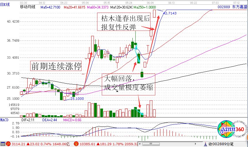 好在股價(jià)跌至60日線附近受到了支撐,同時(shí)成交量是極度的萎縮的,顯然完全符合了“枯木逢春”形態(tài)的特征,這就表明了該股空頭力量已經(jīng)得到了充分的釋放,后期價(jià)格迎來反彈那的可能性比較大。5月31號(hào)之后,大盤走勢(shì)也較給力,更進(jìn)一步刺激了東方嘉盛的反彈。我們可以看到東方嘉盛三天累計(jì)反彈幅度超28%!