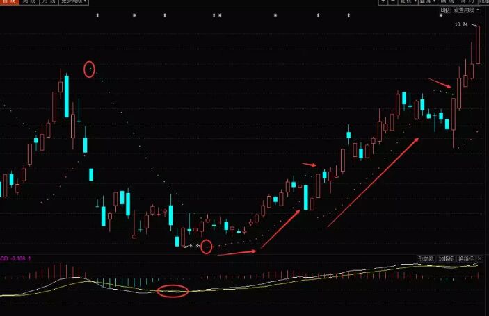 如果拋物線剛剛轉變成紅色時,副圖指標MACD在零線以下形成金叉時,則預示效果更強,而金叉距離零線越遠,則后期漲勢越發(fā)強勁,而當中途出現(xiàn)陰線打壓時,空頭力量越弱。此外,上漲時綠色線出現(xiàn),而綠色線的下跌角度較小時,則說明只是短暫調(diào)整,之后股價將繼續(xù)上漲,投資者可繼續(xù)持有。