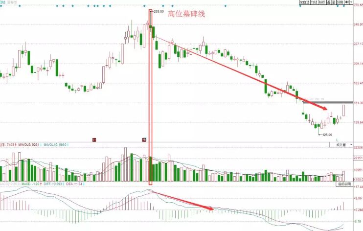1、 高位墓碑線。在股價(jià)出現(xiàn)墓碑線,有判斷主力意圖時(shí),還要看股價(jià)的位置。如果股價(jià)上漲幅度較大,積聚較多的獲利盤,一旦量能未能有效跟進(jìn),就會導(dǎo)致獲利資金加速回吐。此時(shí)的墓碑線很有可能標(biāo)志者資金出逃,后市下跌的概率較大。如下面的富瀚微走勢圖。