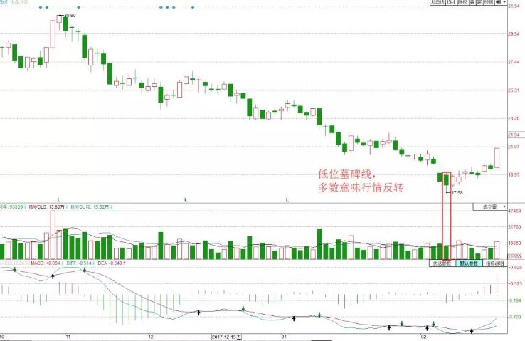 這只股票經(jīng)過連續(xù)下跌,風(fēng)險(xiǎn)得到極大的釋放,隨后出現(xiàn)低位的墓碑線,并且創(chuàng)出17.58的新低,此時(shí)的陰線實(shí)體要大于上一交易的陰線實(shí)體,可成交量的綠柱要小于上一交易日的,這說明市場恐慌性拋壓盤進(jìn)一步變?nèi)酰I入的資金要大于賣出的資金。