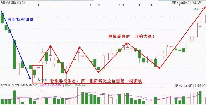 1、 九陽(yáng)股份。下面是該股在歷史上的部分截圖,從屠宗我們可以看到,股價(jià)前期持續(xù)下跌調(diào)整,在底部出現(xiàn)了看漲吞沒的K線組合,隨后出現(xiàn)震蕩,開啟了主升浪。