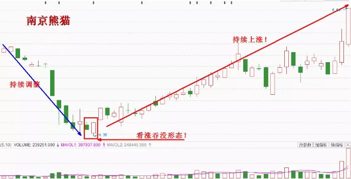 2、南京熊貓。下圖是南京熊貓?jiān)跉v史上的部分截圖,這只股票同樣在下跌調(diào)整的底部出現(xiàn)可看漲吞沒形態(tài),隨后股價(jià)也進(jìn)入到了主升浪部分,這樣就能夠收獲非常不錯(cuò)的利潤(rùn)。