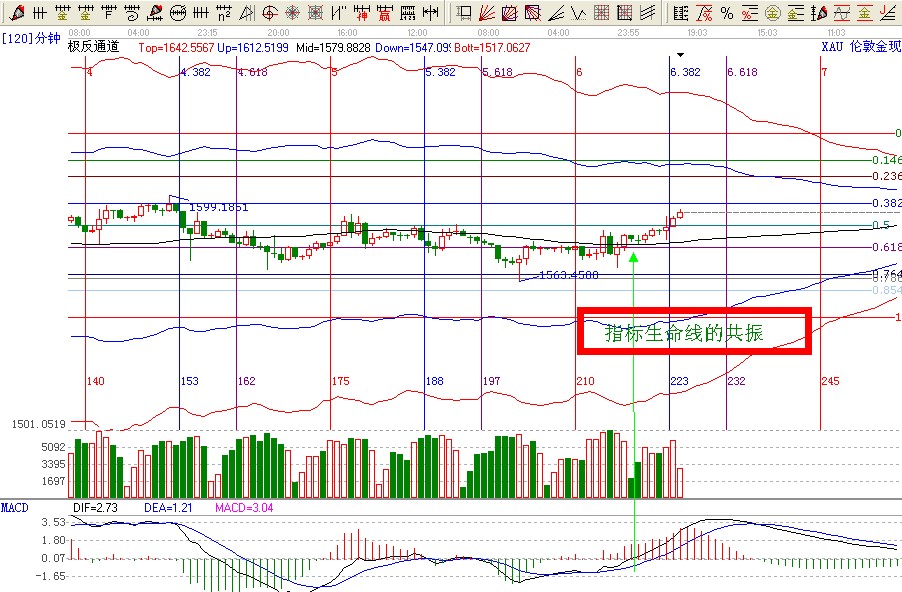 在黃金上穿極反通道生命的時(shí)候,指標(biāo)macd 柱子是紅色的,但是黃白線沒(méi)有上0軸不夠強(qiáng)勢(shì)。當(dāng)指標(biāo)macd黃白線上0軸 的時(shí)候,柱子也是紅色的時(shí)候,這個(gè)時(shí)候黃金在上面突破極反通道生命線然后回踩生命線。指標(biāo)macd跟贏家極反通道形成了共振的買(mǎi)點(diǎn)。