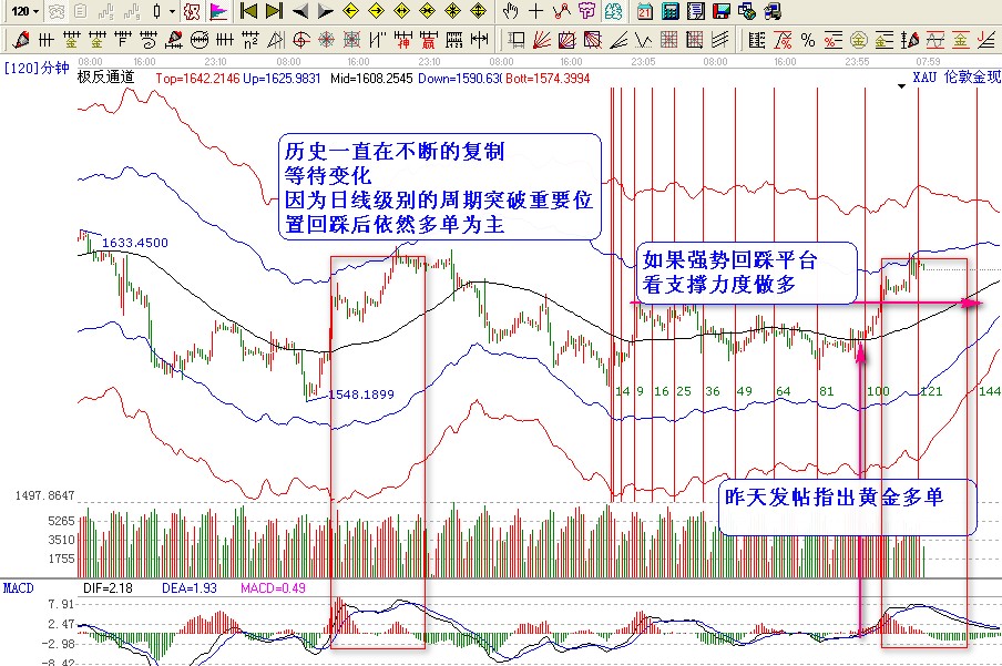 然后引發(fā)了一輪暴跌,但是這次是日線突破重要的壓力線位置,日線開始強(qiáng)勢(shì),回踩就有所減免,回踩反而是多單的位置說以關(guān)鍵位置還是macd指標(biāo)的構(gòu)成過程跟下跌的幅度,120分時(shí)間周期中極反通道生命線更跟前期的平臺(tái)位置構(gòu)成了極強(qiáng)的支撐力度,回踩這個(gè)位置不破可以多單。。。。。