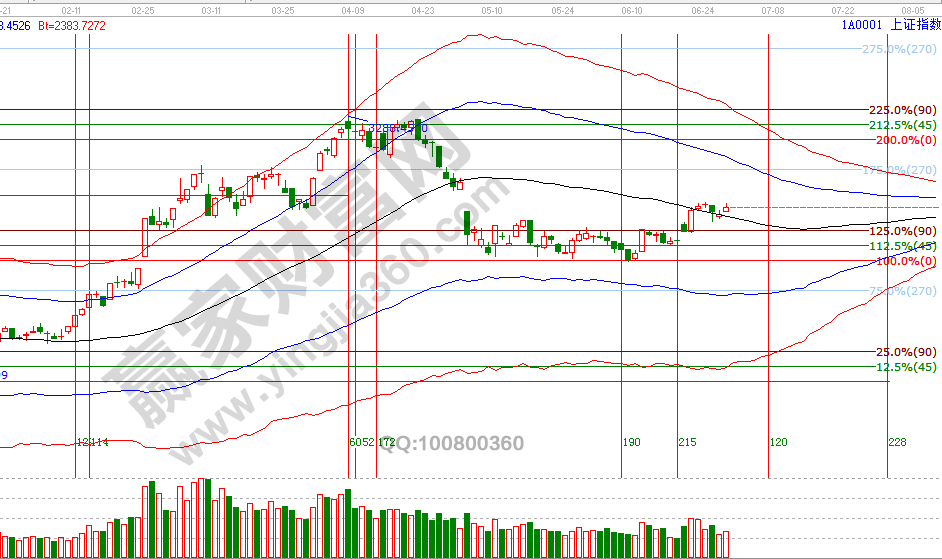 截至今日收盤A股滬深指數(shù)時隔39個交易日再度雙雙收復極反通道生命線,先行指數(shù)上證50已上攻至藍色上軌線反壓附近,結合各周期走勢大盤將延續(xù)反彈動作;空間點位方面,江恩價格四方形、波段百分比線工具顯示,3016-3036區(qū)間同極反通道短周期共振,按買在支撐賣在壓力原則,2840附近支撐位買入,第一目標位2950減一次倉,接下來3016-3036區(qū)間附近又一次分批獲利參考位;時間方面,7月3號是下一個日線時間窗口,6月27號盤中壓力是45度3016點、90度3036點,盤中支撐是270度2961點、315度2978點。操作策略,指數(shù)極反通道生命線附近震蕩,反彈延續(xù)中,整體持倉保持3-5左右。